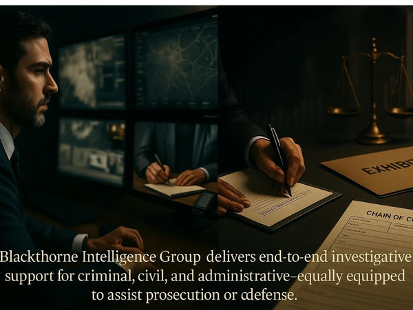 Blackthorne Intelligence Group delivers end-to-end investigative support for criminal, civil, and administrative matters—equally equipped to assist prosecution or defense. We combine discreet surveillance, structured interviews, and deep records research with courtroom-ready documentation and chain-of-custody. Attorney-directed and privilege-protected options are available for sensitive matters.